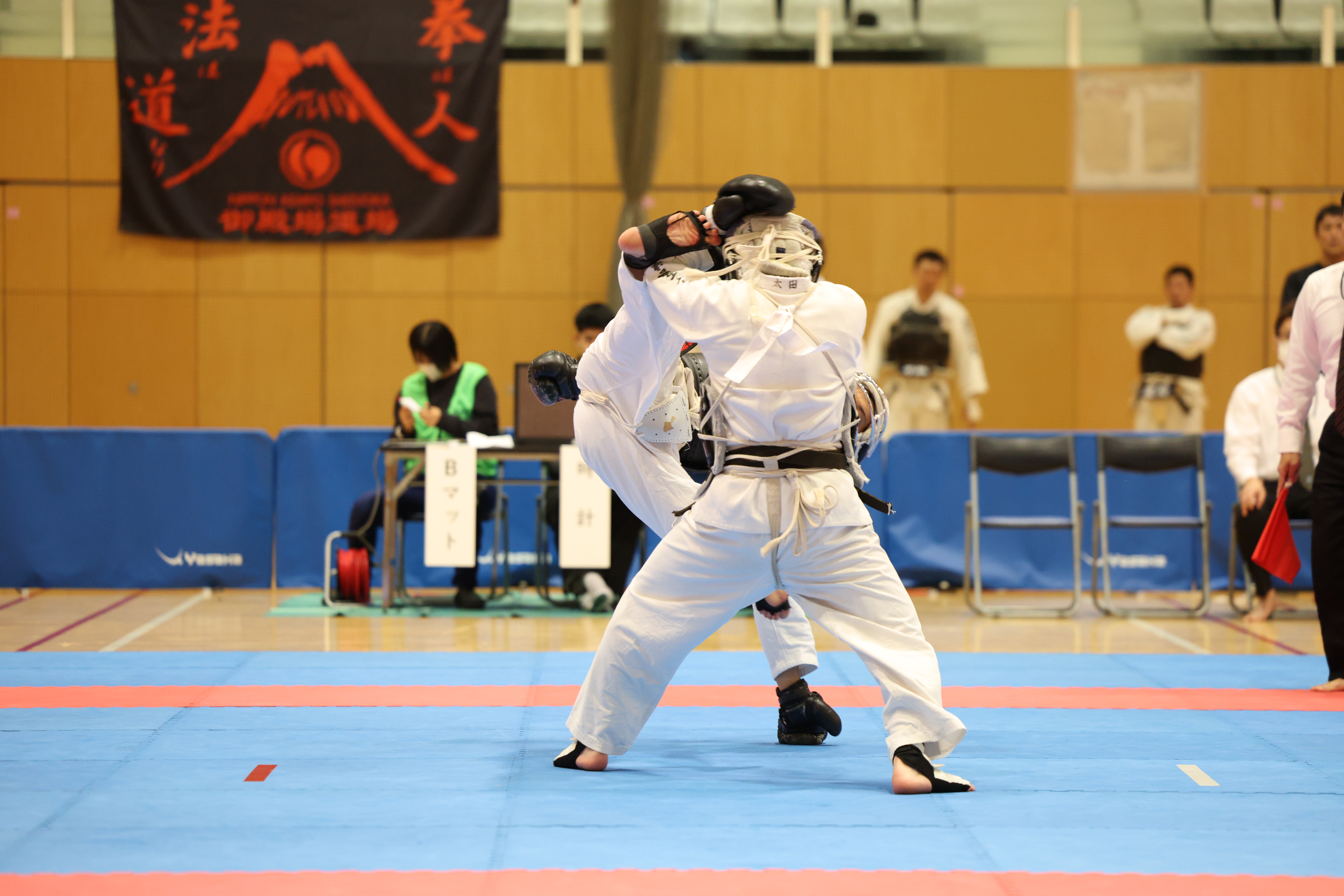 | 令和6年度 日本拳法・全日本体重別選手権大会 男子73kg未満の部。 赤:慶應義塾大学・ソーナイン vs 白:陸自遠軽/第25普通連隊・木村。ソーナインの面蹴りを木村がガード。 撮影:Inno |