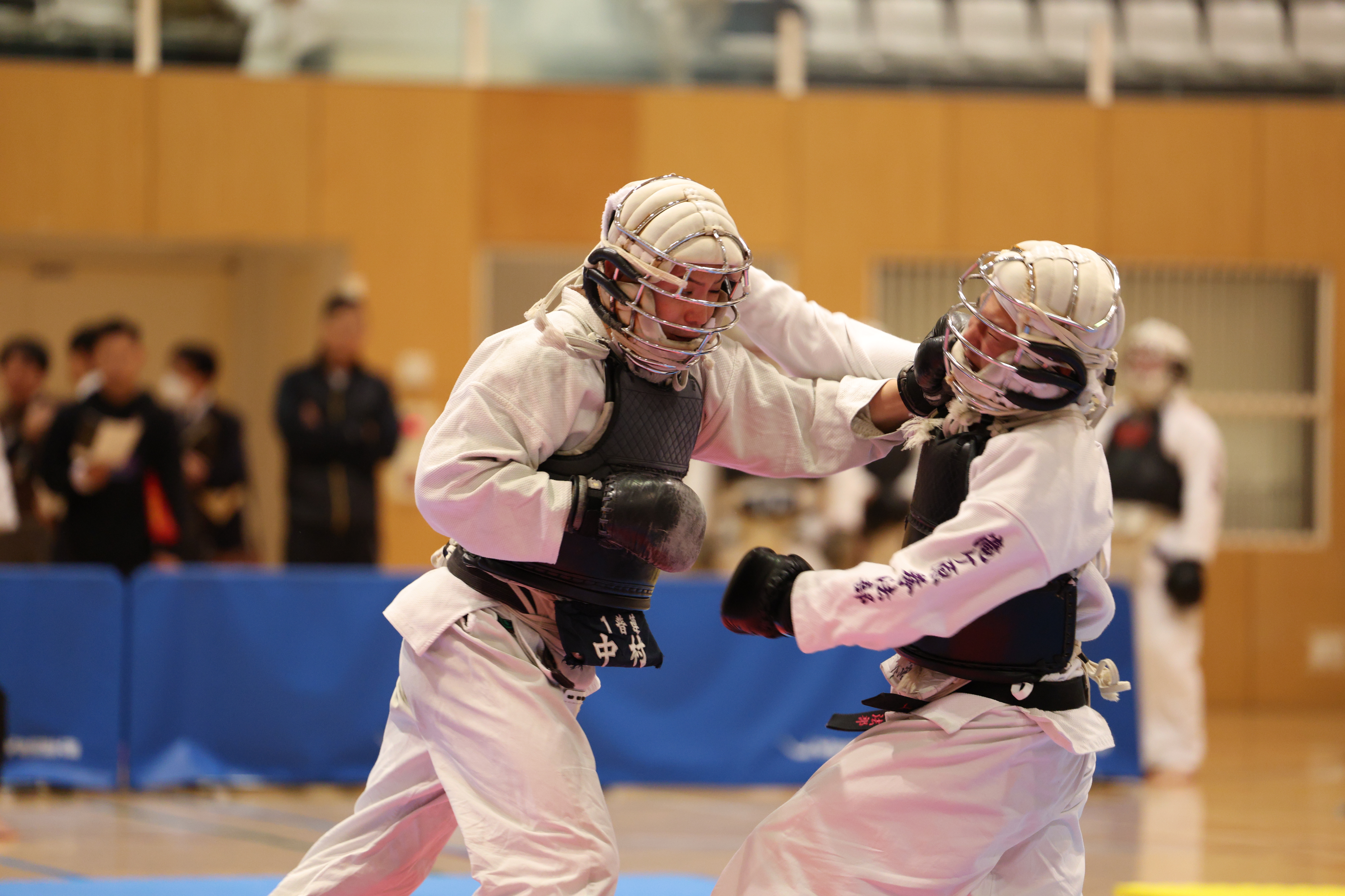 | 令和6年度 日本拳法・全日本体重別選手権大会 男子73kg未満の部。 赤:陸自練馬/第1普通科連隊・中村の左面突き(一本)。 撮影:Inno |