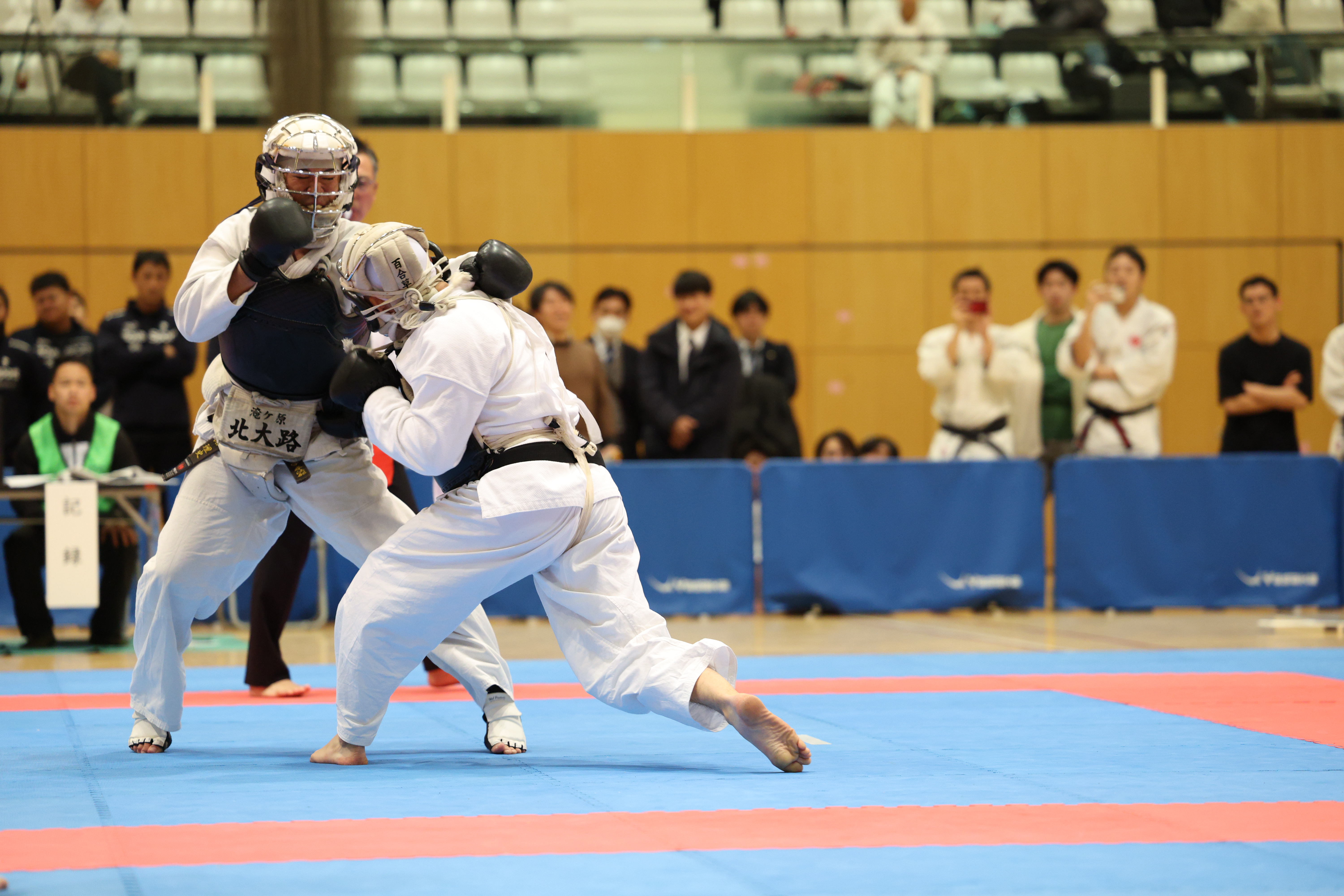 | 令和6年度 日本拳法・全日本体重別選手権大会 男子81kg未満の部、決勝戦。 赤:駿台拳法クラブ・百合草の右胴突き(一本)。 撮影:Inno |