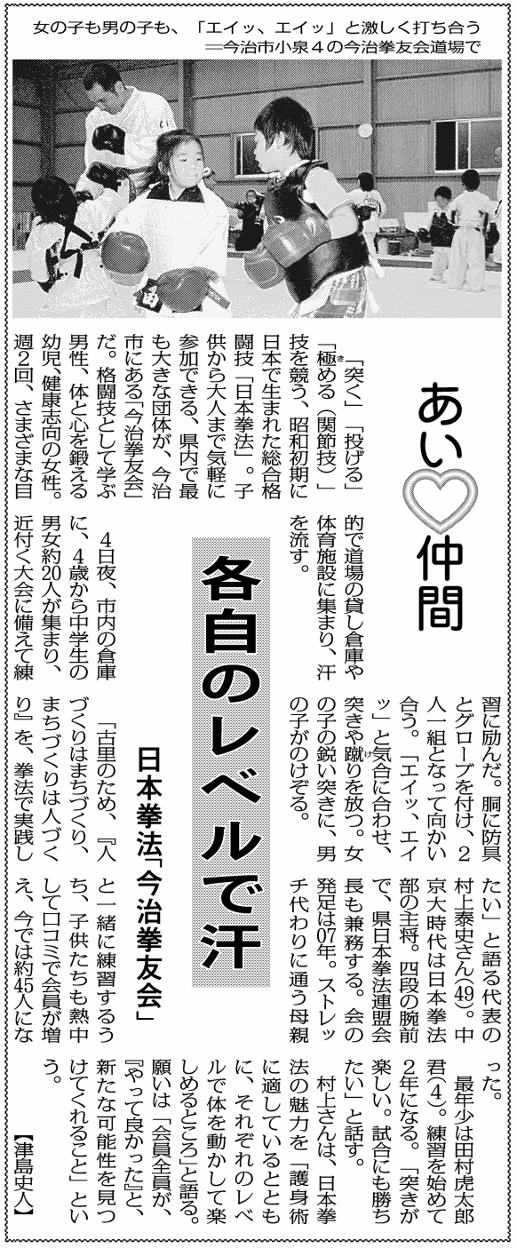 「突く」「投げる」「極(き)める(関節技)」技を競う、昭和初期に日本で生まれた総合格闘技「日本拳法」。子供から大人まで気軽に参加できる、県内で最も大きな団体が、今治市にある「今治拳友会」だ。格闘技として学ぶ男性、体と心を鍛える幼児、健康志向の女性。週2回、さまざまな目的で道場の貸し倉庫や体育施設に集まり、汗を流す。