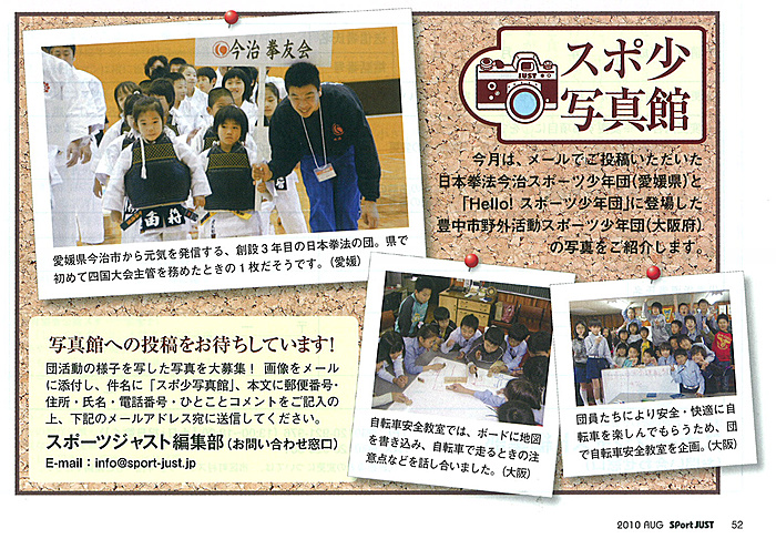 【本文】 今月は、メールでご投稿いただいた日本拳法今治スポーツ少年団(愛媛県)と「Hello!スポーツ少年団」に登場した豊中市野外活動スポーツ少年団(大阪府)の写真をご紹介します。