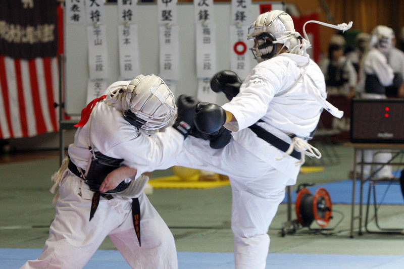 | 日本拳法第28回全国大学選抜選手権大会 赤:関西学院大学・梅田vs白:中央大学・中村。中村の胴蹴り(一本)。 撮影:Inno |