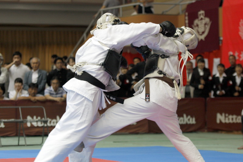 | 日本拳法第28回全国大学選抜選手権大会 赤:日本大学・田口vs白:早稲田大学・佐々木。佐々木の面突き(一本)。 撮影:Inno |