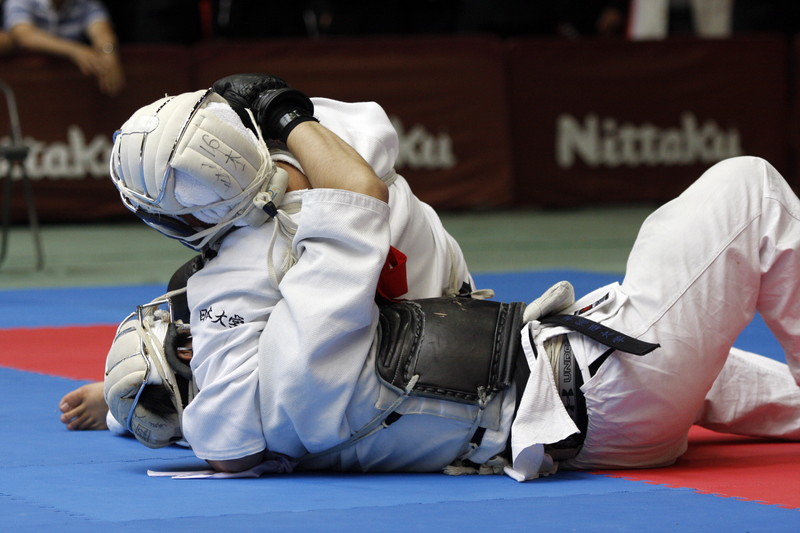 | 日本拳法第28回全国大学選抜選手権大会 赤:日本大学・四宮vs白:早稲田大学・森。四宮の逆捕り(一本)。 撮影:Inno |