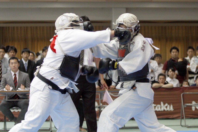 | 日本拳法第28回全国大学選抜選手権大会 赤:日本大学・四宮vs白:早稲田大学・森。四宮の面突き(一本)。 撮影:Inno |