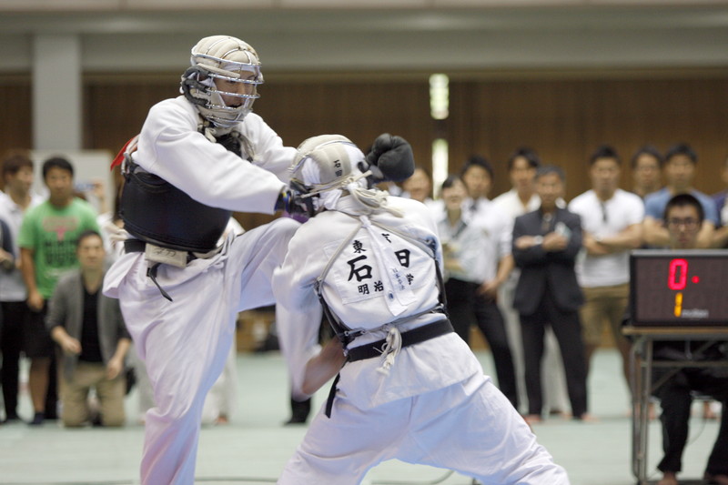 | 日本拳法第28回全国大学選抜選手権大会 赤:立命館大学・横手vs白:明治大学・石田。横谷の胴蹴り(一本)。 撮影:Inno |