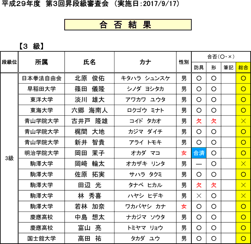 2016年11月20日(土)付※允許状・認定証交付申請なき場合、合格した段級位は正式には認められません。