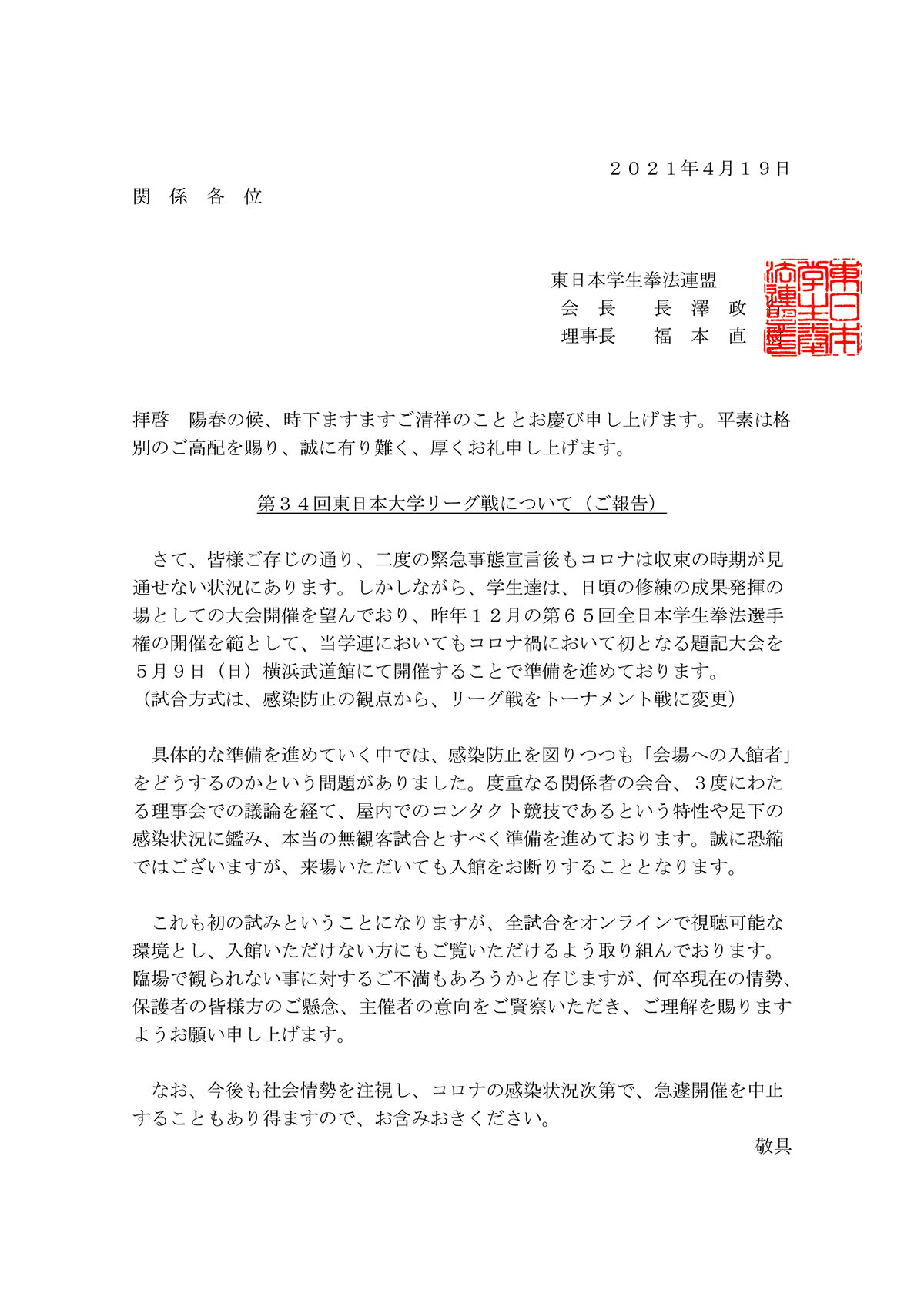 第34回東日本大学リーグ戦について ➡ 無観客にて開催(オンライン放映実施)