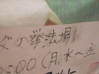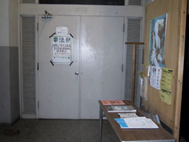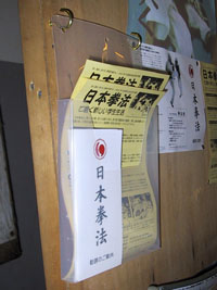 | ↑立正大学拳法部の拳法場前には、どこから持ってきたのか、大型の掲示板が設置されている(写真右)。この板なら、A2サイズのポスターでは小さすぎるかもしれない。 |